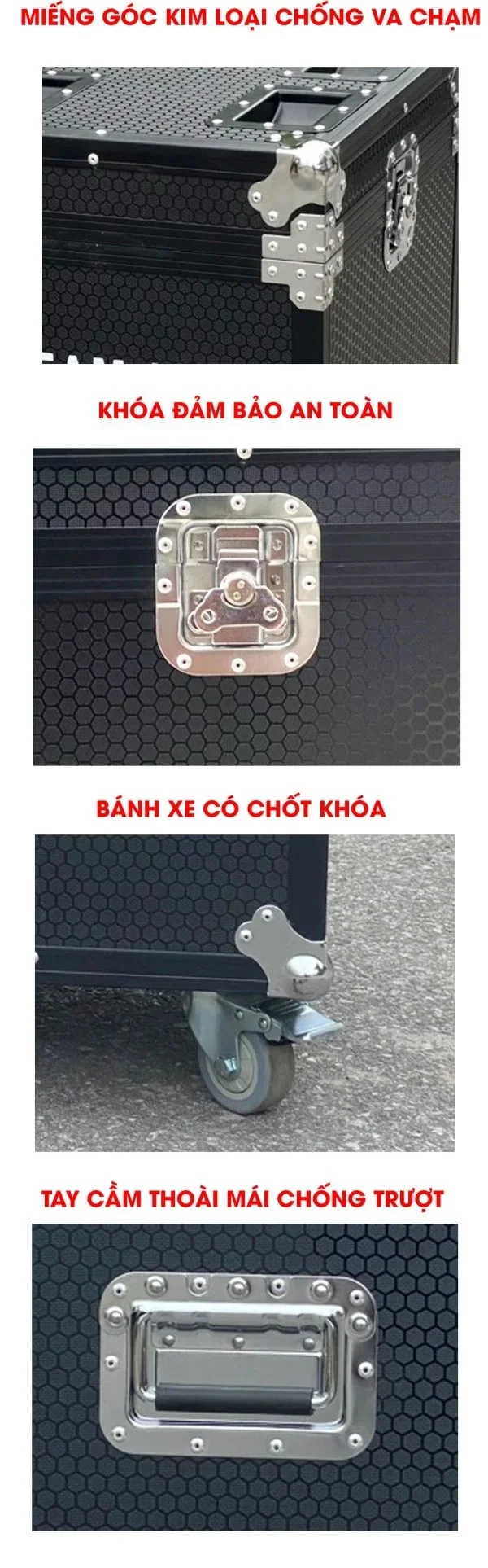 Khung sườn được ốp nhôm chắc chắn, các góc tủ được bo bằng sắt dập mạ crom bóng, trang bị khóa hình cánh bướm rất tiện dụng.